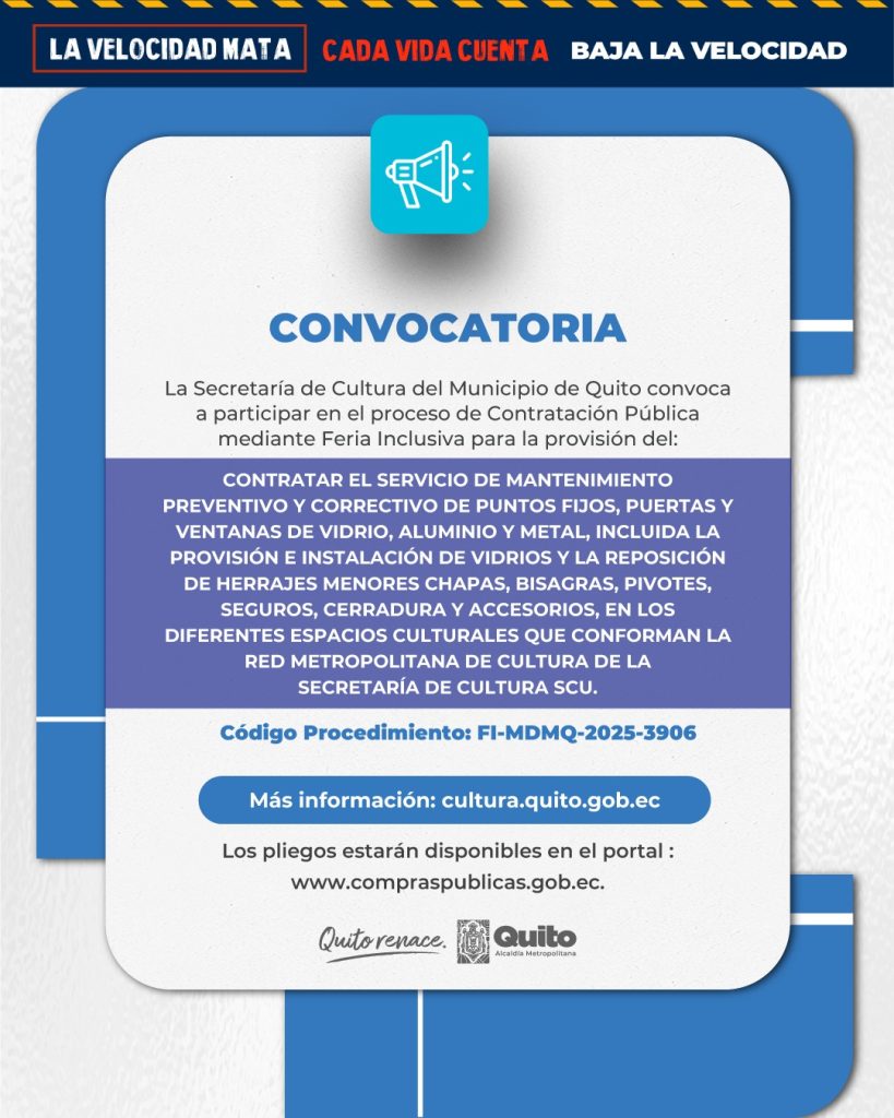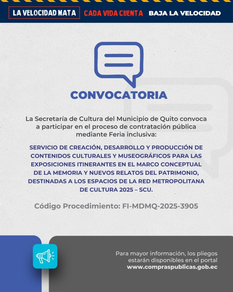 La Secretaría de Cultura del Municipio de Quito convoca, a través del portal www.compraspublicas.gob.ec y de la página web institucional, a las Organizaciones de economía popular y solidaria: sectores comunitarios,